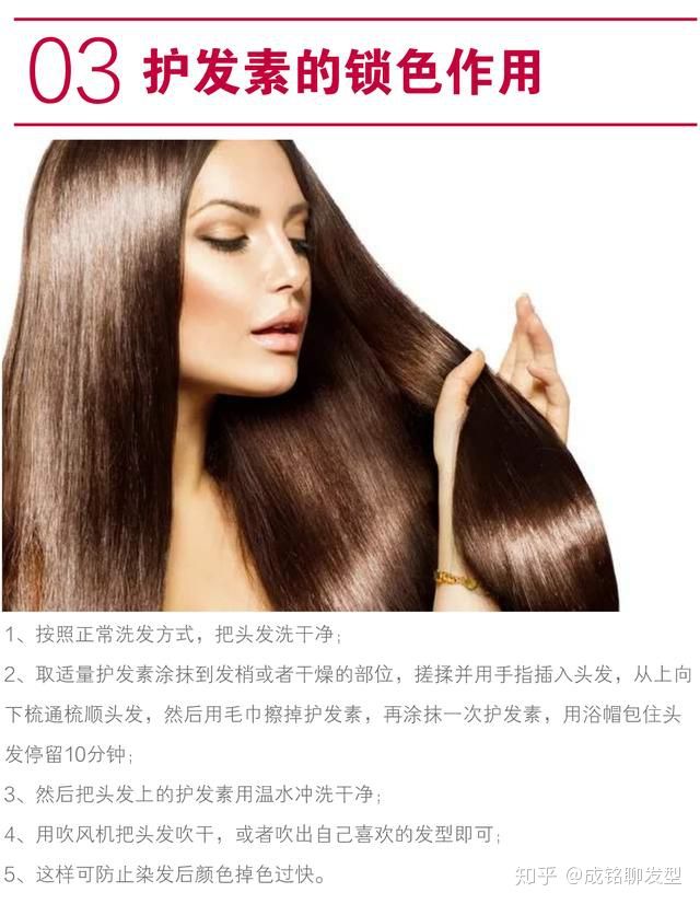 温馨提示:这种方法主要针对染过颜色的头发,尤其是刚染完48小时后第一次洗发的适合,效果最好。因为染发掉色主要和洗发有关,洗发后强化护发素的作用,利用护发素的包裹特性,让毛鳞片闭合更紧密,这样色素流失速度就减缓很多。烫过的头发如果比较干燥,也可以用这种方法增加顺滑度和光泽度。