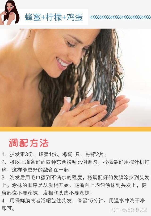 温馨提示:蜂蜜含有丰富的营养成分,可很好的修复毛鳞片,补充角质蛋白的韧性,锁水效果非常好;鸡蛋主要是补充蛋白质,在柠檬的作用下能够渗透到头发的深层;柠檬具有非常好的排碱作用,把残留在头发中的碱性物质排出发体外。加上护发素本身的润滑作用,做完效果不亚于专业发膜和护发素的效果。