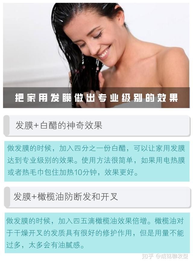 温馨提示:利用家里厨房烹调用的白醋和食用橄榄油,就可以把你家庭用的发膜升级到专业级别的效果。大部分家庭用的发膜都是免加热的,加入白醋或橄榄油好,适当加热会让发膜的效果加倍。加热的方法很多种,有电热帽最省事,没有的话可先用浴帽包住头发,再给外面包一层开水烫热的毛巾,也能起到加热效果。
